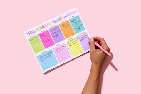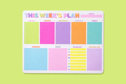 Our This Week Weekly List Pad Planner is a colorful and functional tool designed to bring order to your week. This planner features dedicated sections for each day of the week, allowing you to organize your tasks seamlessly. In addition to daily sections, we've included a general to-do section, weekend section, and a place to include what you're grateful for each week.