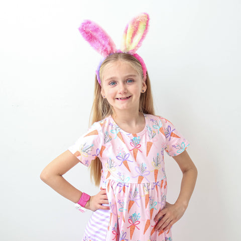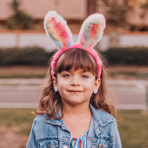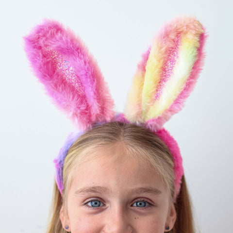Sparkly glitter bunny ears * Super soft and fuzzy material * 13" size to best-fit toddlers to tweens * Made with rainbow tie dye fabric so each headband is unique * Makes for adorable Easter basket stuffers